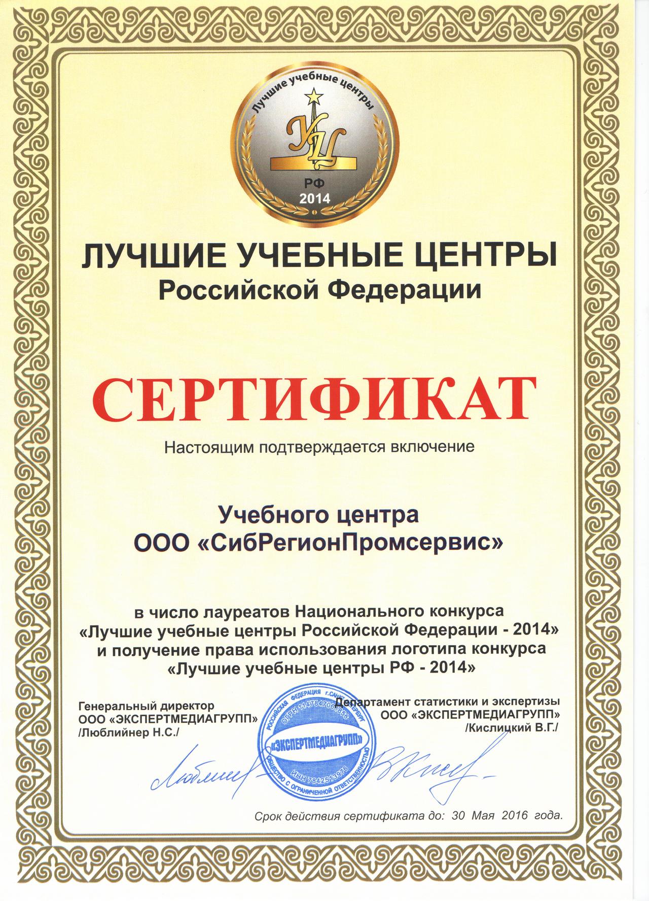 Учебный центр ООО "СибРегионПромсервис" стал лауреатом Национального конкурса "Лучшие учебные центры РФ 2014"